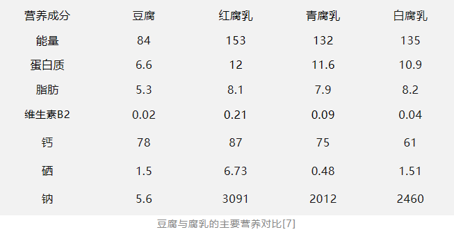 腐乳保留了豆腐中原有的脂肪、蛋白质、钙等营养,同时维生素 B2、维生素 B6 等含量有增加,比如红腐乳的维生素 B2 含量是豆腐的 10.5 倍。